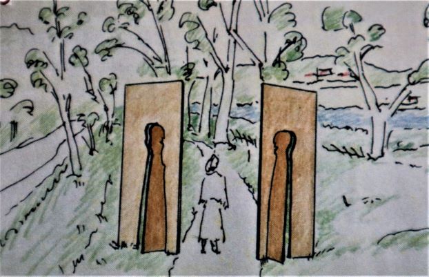 "Margarethe und Vitus" von Tilman Hornung (Bergtheim) - "Mann und Frau als Symbol der beiden Ortspatronen Hl. Margarethe und Hl. Vitus stehen sich gegenüber und treten aus der Torfläche heraus. Der Weg deutet den Main an durch den beide Orte getrennt sind und dennoch einen gemeinsamen Weg gehen. Die Schrägen deuten die Verbindung durch die neue Brücke an."
