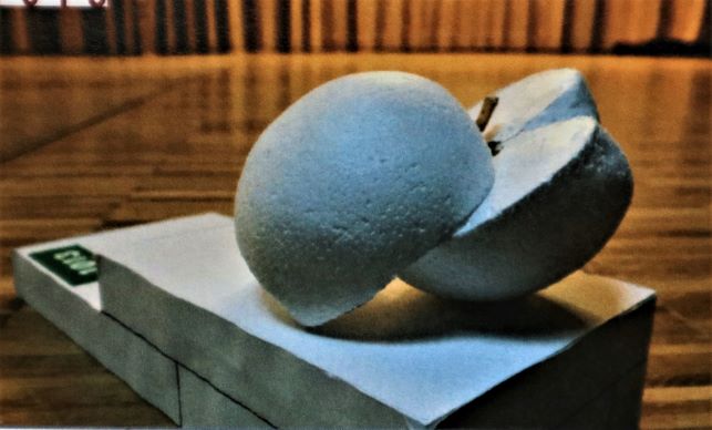 "Apfelhälften" von Dirk Berthel (Rannungen) - "Mit meinem Entwurf möchte ich einer Frucht nicht nur ein Denkmal setzen sondern auch ein Signum für den örtlichen Obstanbau an sich. Auf einem einstufigen Podest aus rotem Sandstein zeigt sich ein in 2 Hälften geschnittener Apfel aus Muschelkalk."