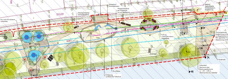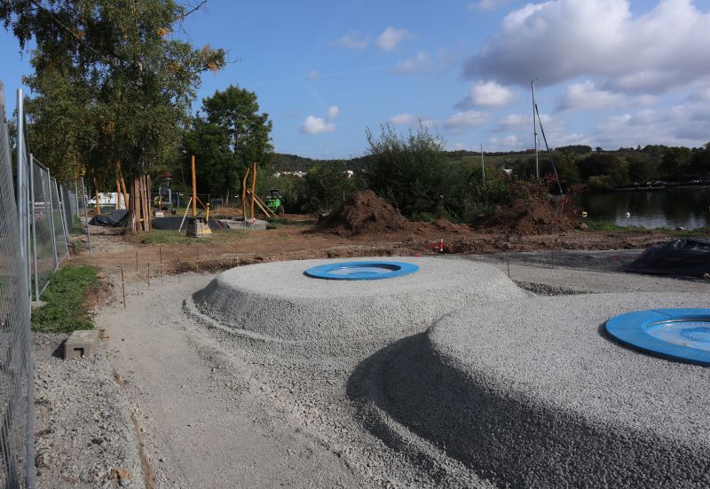 Sichtlich gut voran gehen die Bauarbeiten im ersten Bauabschnitt (BA I) der Mainlände zwischen Steinernem Weg und neuem Steg. Man kann schon erahnen, wie es dort in Kürze aussehen wird - schließlich soll die Umgestaltung bis Ende Oktober abgeschlossen sein. Mittlerweile hat die Baufirma die Planums für die Spielflächen, die Holzpodeste am Ufer und den "mäandernden Weg" größtenteils hergestellt; teilweise wurden in den Spielbereichen schon einzelne Elemente wie die bodengleichen "Teich"-Trampoline installiert. Auch die Fundamente für die drei Kunstwerke wurden bereits errichtet; die fertigen Werke sind bereits eingelagert und werden direkt montiert, sodass der gesamte Bauabschnitt der Mainlände "in einem Rutsch" fertig wird, erklärte Bürgermeister Waldemar Brohm beim jüngsten Ortstermin mit dem Umweltausschuss.