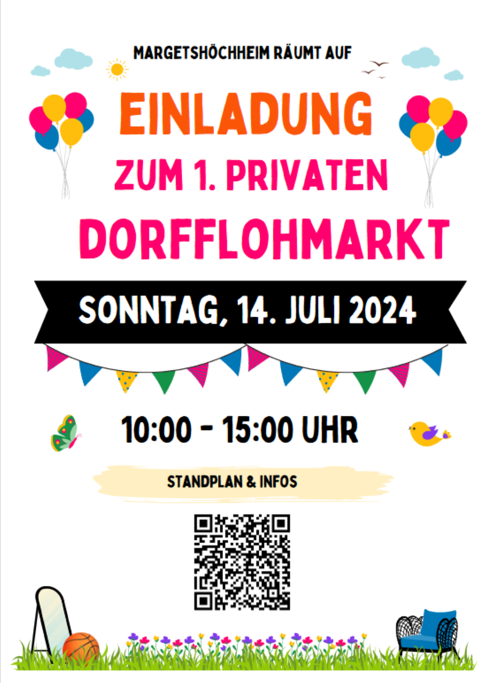 Am Sonntag, den 14. Juli findet von 10:00-15:00 Uhr ein Dorfflohmarkt in den Höfen und Gärten statt, es sind über 100 Stände angemeldet. Den Standplan finden Sie auf google maps unter dem folgenden Link: https://www.google.com/maps/d/edit?mid=1JrGPvpBSylQtLYA7zjYccQmw61OprT4&usp=sharing sowie per QR-Code auf dem Flohmarkt-Flyer: