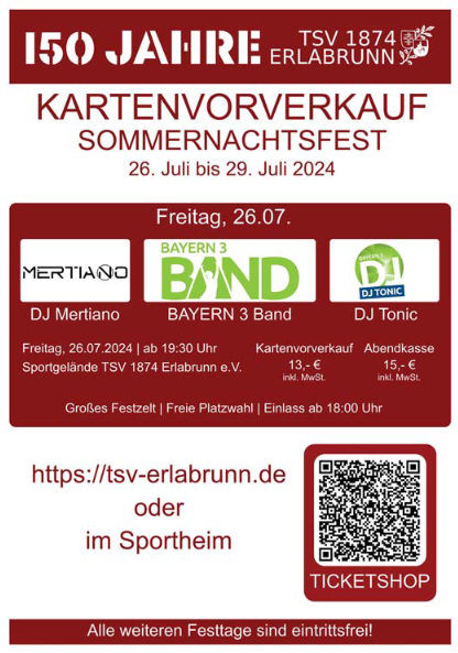 Der TSV Erlabrunn feiert heuer 150-jähriges Jubiläum, zum Sommernachtsfest am Sportgelände Erlabrunn spielt am Freitag, den 26. Juli die bekannte Bayern 1 Band. Karten kosten im Vorverkauf 13 Euro, an der Abendkasse 15 Euro. An den übrigen Festtagen ist der Eintritt frei.