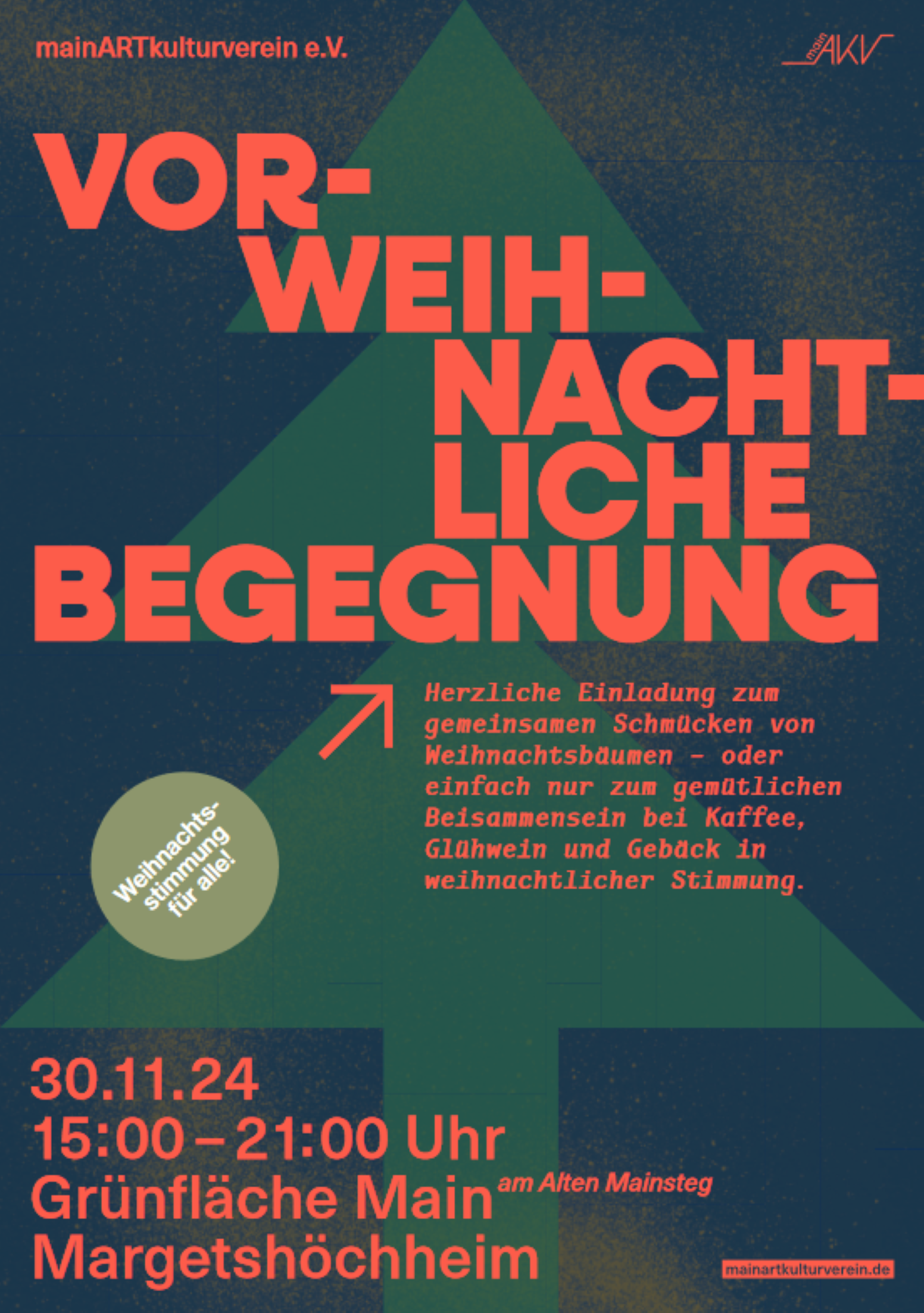 Am Samstag, den 30. November veranstaltet der mainART-Kulturverein von 15:00-21:00 Uhr ein kollektives Weihnachtsbaum-Schmücken auf der Grünfläche am Rathaus mit vorweihnachtlicher Begegnung. Für das leibliche Wohl ist gesorgt mit Plätzchen, Glühwein, Punsch und Funky Pizza aus dem Holzofen von Rainer Funk. Die Mainfränkischen Werkstätten verkaufen handwerkliche Produkte. Für weihnachtliche Stimmung sorgen adventliche Texte und musikalische Einlagen.