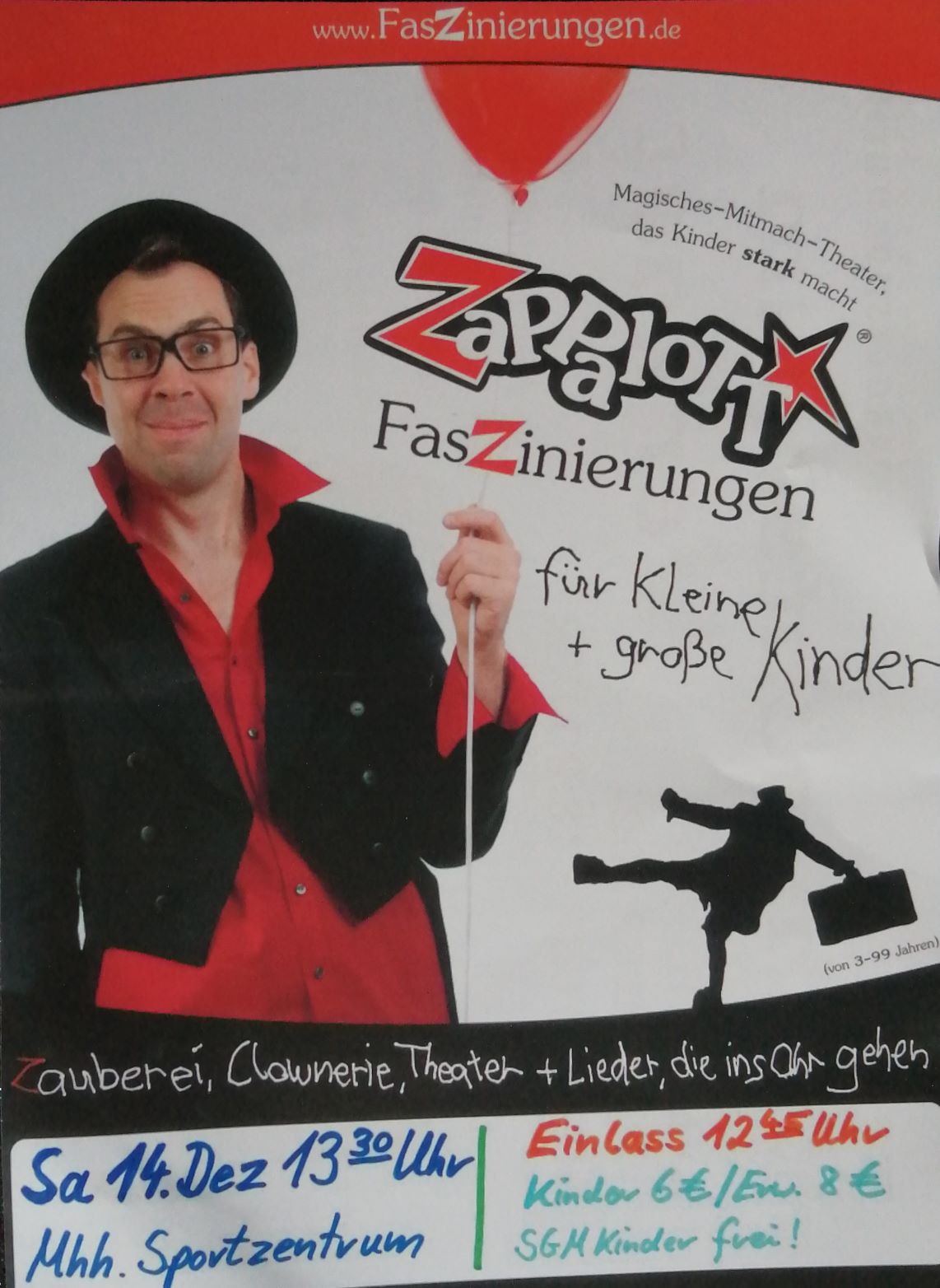 Am 14. Dezember veranstaltet die SGM wieder das beliebte Zaubertheater mit Zauberer Zappalott. Es gibt Zauberei, Clownerie und Lieder, die ins Ohr gehen. Einlass ab 12:45 Uhr. Karten kosten 6 Euro für Kinder, 8 Euro für Erwachsene, SGM-Kinder sind frei.