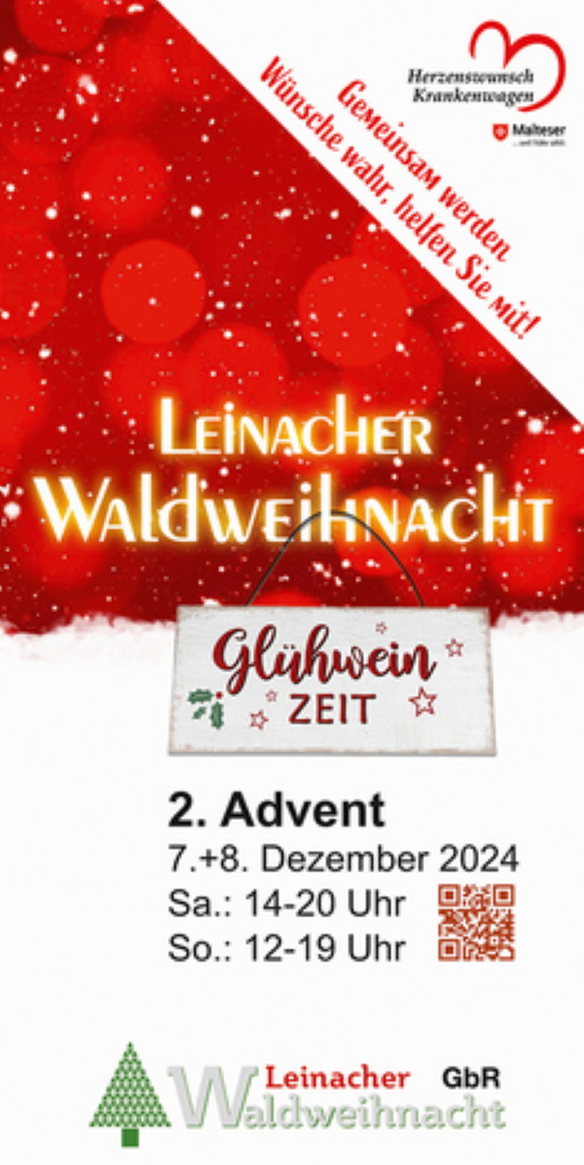 Am 2. Adventswochenende findet in Leinach wieder die beliebte Waldweihnacht statt. Das Programm und weitere Infos finden Sie unter https://www.leinacher-waldweihnacht.de/index.php?option=com_content&view=article&id=35&Itemid=101