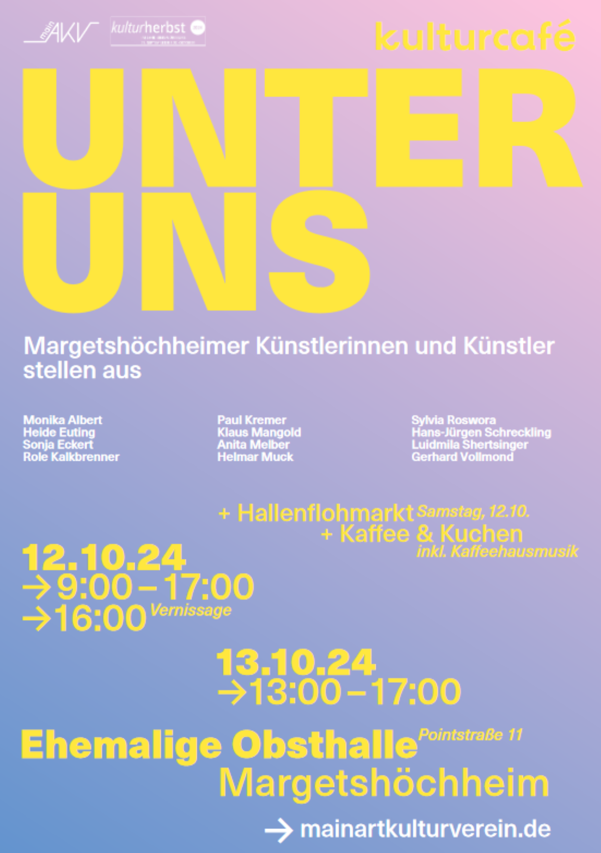 Am Samstag, den 12. Oktober und Sonntag, den 13. Oktober veranstaltet der mainART-Kulturverein im Rahmen des Kulturherbstes in der Alten Obsthalle (Pointstr. 11) eine Kunstausstellung mit Kulturcafé.